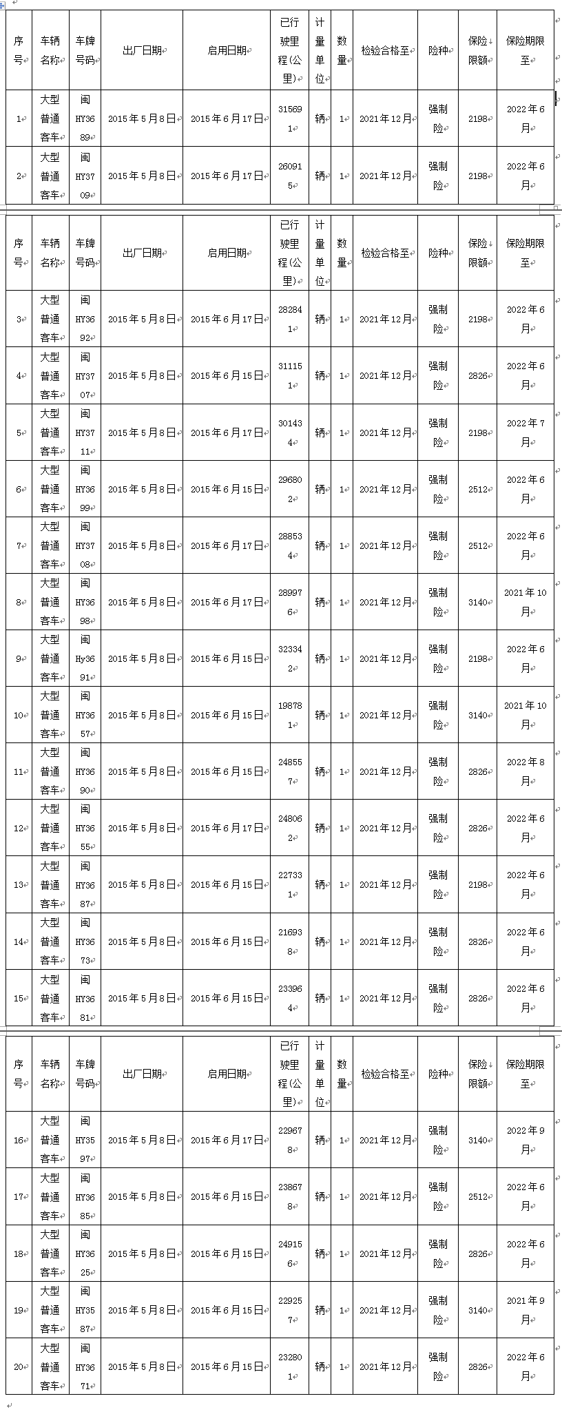 標的存放在南平市建陽區西區公交站和云谷公交站,廠牌型號: 金旅牌XML6103J58大型普通客車;車身顏色為白/綠,由廈門金龍旅行車有限公司生產;使用性質:公交客運;燃料種類:柴油;總質量:14750kg;外廓尺寸:10490mm(長)2500m(寬)3600mm(高);排量功率:8424ml/206kw;核定載客41人;車輛出廠日期:2015年5月8日;發證日期:2015年6月15日或2015年6月17日。這20部車輛主要承擔京福高鐵南平市站至建陽城區或武夷山度假區的運營路線,其車輛已行駛的公里數為20萬至32萬之間,這些車輛均在正常營運,有專門人員進行維護保養。 |